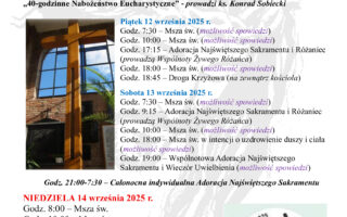 - Przygotowujemy się duchowo do uroczystości odpustowej w naszej parafii. Zapraszamy na różaniec prowadzony przez wspólnoty różańcowe, w dni powszednie o godz. 17:15, a w niedziele o godz. 9:15.