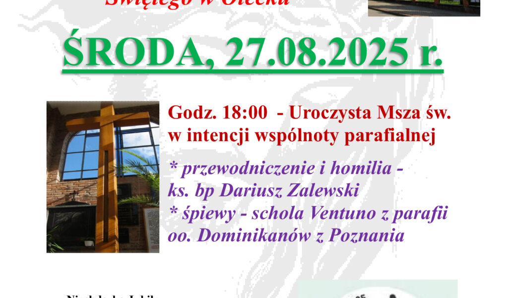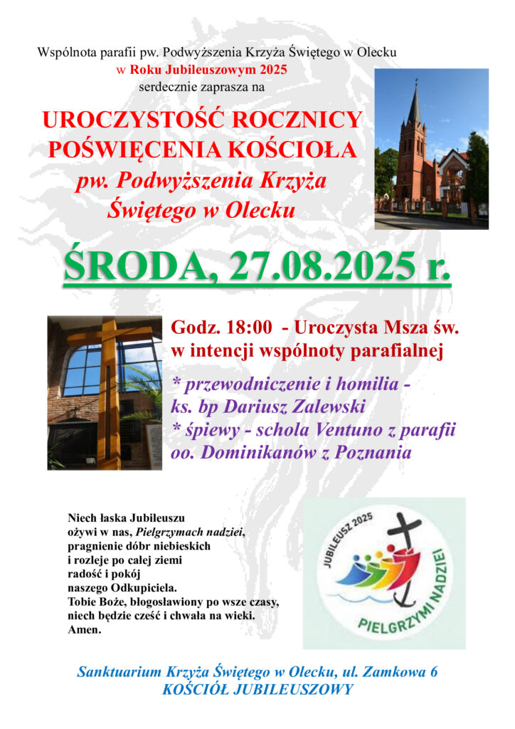 Dnia 27 sierpnia 1862 r. Bp Antoni Frenzel, biskup pomocniczy warmiński, dokonał uroczystej konsekracji kościoła katolickiego w Olecku (Margrabowej). Dlatego w środę 27 sierpnia będziemy przeżywać 163. rocznicę poświęcenia kościoła Podwyższenia Krzyża Św. w Olecku. Zachęcamy do wspólnej modlitwy za całą naszą wspólnotę parafialną: za duszpasterzy, pracowników, ofiarodawców i dobroczyńców Sanktuarium, ale też za osoby chore, samotne, uwikłane w problemy, nałogi, żyjące z daleka od Boga. Zjednoczmy się tego dnia na wspólnej modlitwie pod przewodnictwem biskupa pomocniczego ełckiego – ks. bp. Dariusza Zalewskiego. Eucharystię o godz. 18:00 uświetni Schola „Ventuno” z Poznania. Zapraszamy!