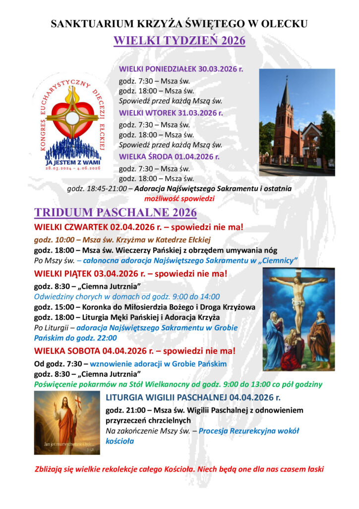 Św. Leon Wielki podkreślał, że wszystkie czyny widoczne w życiu Zbawiciela przeszły do liturgii, która je nie tylko wspomina, ale również celebruje, ukazując nam, że również my możemy być uczestnikami wydarzeń z czasów Chrystusa. W ten sposób misterium jest niepodzielne i zawsze występuje jako jedna całość, i dlatego bardzo prosimy, abyśmy nie pozbawiali siebie możliwości pełnego uczestniczenia w Misterium Paschalnym Chrystusa, bo jeśli z czegoś zrezygnujemy, to nasze życie duchowe będzie o wiele uboższe. Bardzo prosimy i zachęcamy, abyśmy mogli w pełni świadomie w tej liturgii uczestniczyć. Przygotujmy się poprzez spowiedź – sakrament pokuty będzie sprawowany do środy (w Triduum i Święta Wielkanocne spowiedzi nie będzie). Przygotujmy się duchowo już w domach, wyciszmy i oddajmy ten czas Chrystusowi, niech to będę wyjątkowe i inne niż zawsze REKOLEKCJE…