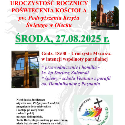 Dnia 27 sierpnia 1862 r. Bp Antoni Frenzel, biskup pomocniczy warmiński, dokonał uroczystej konsekracji kościoła katolickiego w Olecku (Margrabowej). Dlatego w środę 27 sierpnia będziemy przeżywać 163. rocznicę poświęcenia kościoła Podwyższenia Krzyża Św. w Olecku. Zachęcamy do wspólnej modlitwy za całą naszą wspólnotę parafialną: za duszpasterzy, pracowników, ofiarodawców i dobroczyńców Sanktuarium, ale też za osoby …