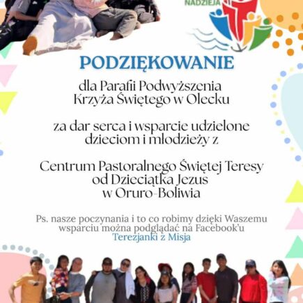 W V Niedzielę Wielkanocną – 18 maja 2025 r. – gościliśmy w naszej parafii s. Joannę Olszewską, terezjankę, która podzieliła się świadectwem posługi misyjnej i zbierała ofiary na wsparcie działalności misyjnej w Boliwii. Siostra Joanna raz jeszcze składa serdeczne podziękowania za złożone ofiary i zachęca, aby śledzić jej działania misyjne poprzez Facebook’a. [https://www.facebook.com/terezjankizmisja] Najbliższa niedziela …