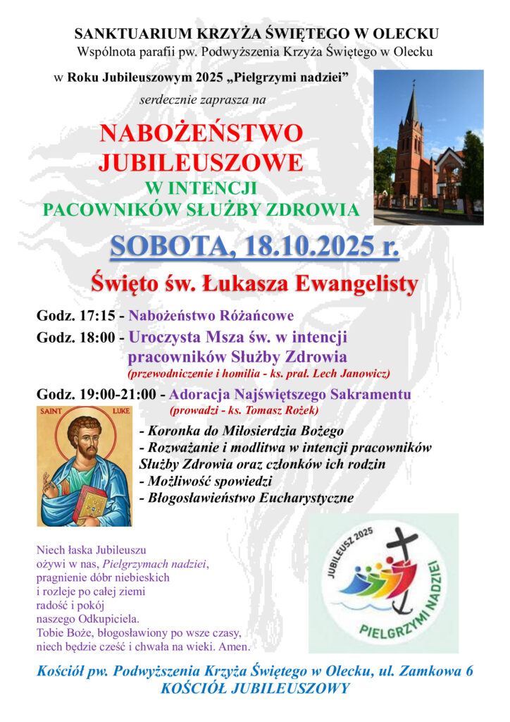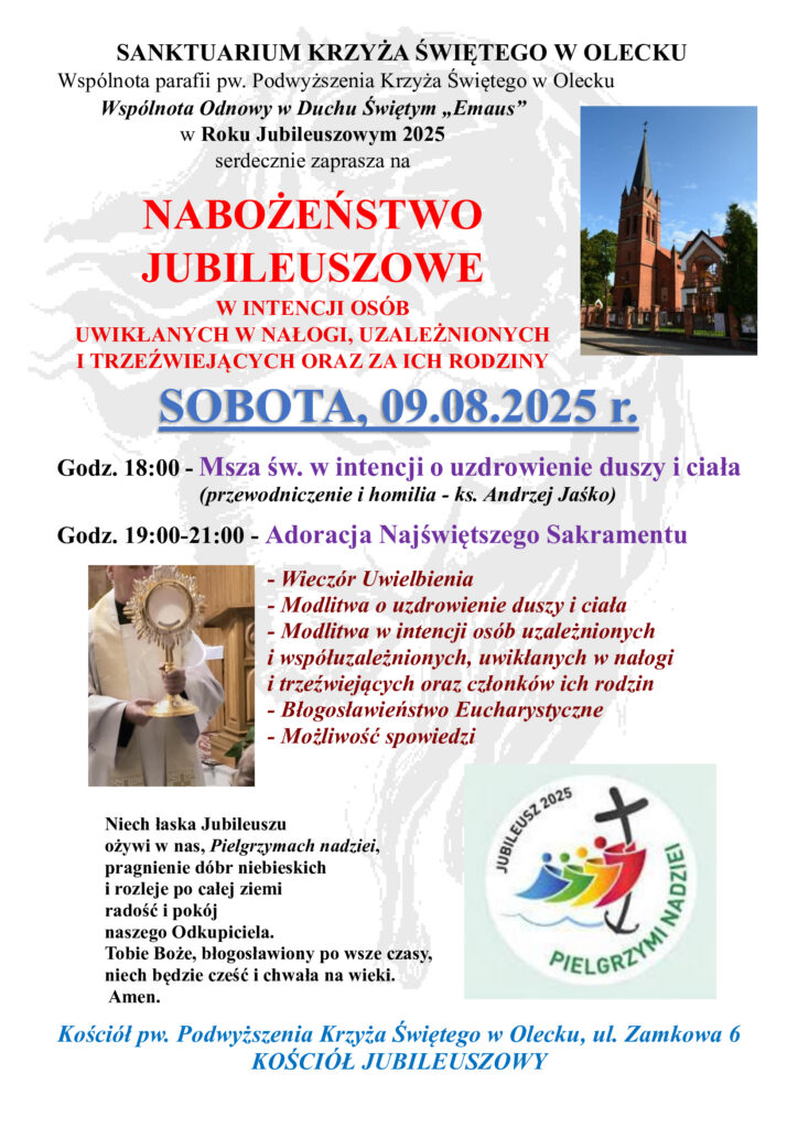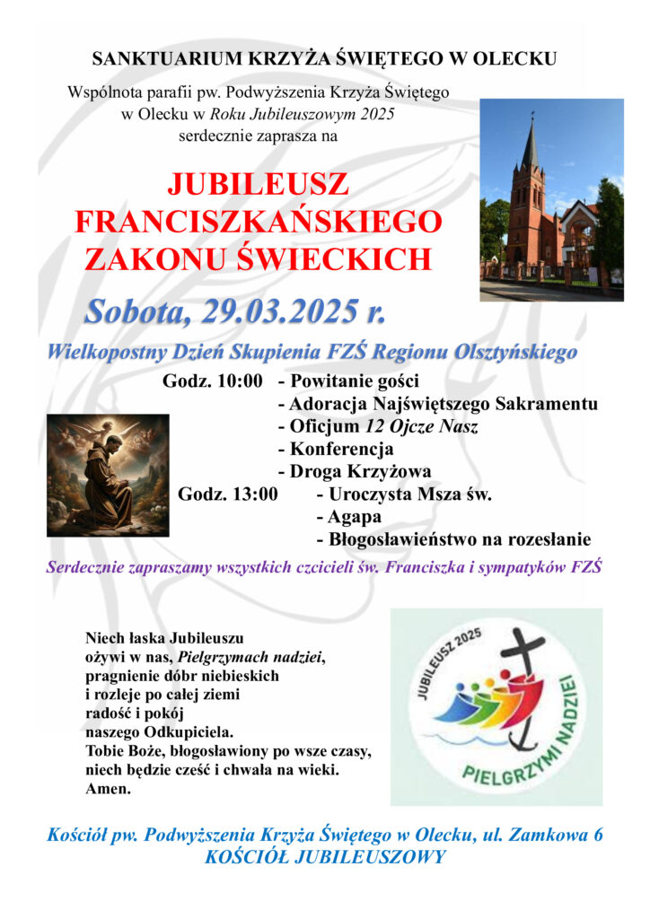 Dekretem Księdza Biskupa Jerzego Mazura SVD, Biskupa Ełckiego, nasz kościół jest jedynym z piętnastu Kościołów Jubileuszowych w Diecezji Ełckiej, na czas Roku Jubileuszowego (a więc od 29 grudnia 2024 r. do 28 grudnia 2025 r.). Sanktuarium Podwyższenia Krzyża Świętego w Olecku ma być więc miejscem pełnego nadziei pielgrzymowania, gdzie wierni mogą dostąpić łaski uzyskania odpustu zupełnego.